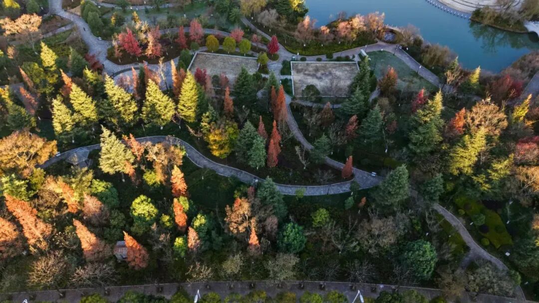 冬日,马龙区水景公园各种树木色彩斑斓,景美如画。俯瞰公园,红色的枫树、橙色的朴树、黄色的水杉、绿色的雪松等各色树木,与清澈碧绿的湖水相映成趣,形成了一道独特的风景线。