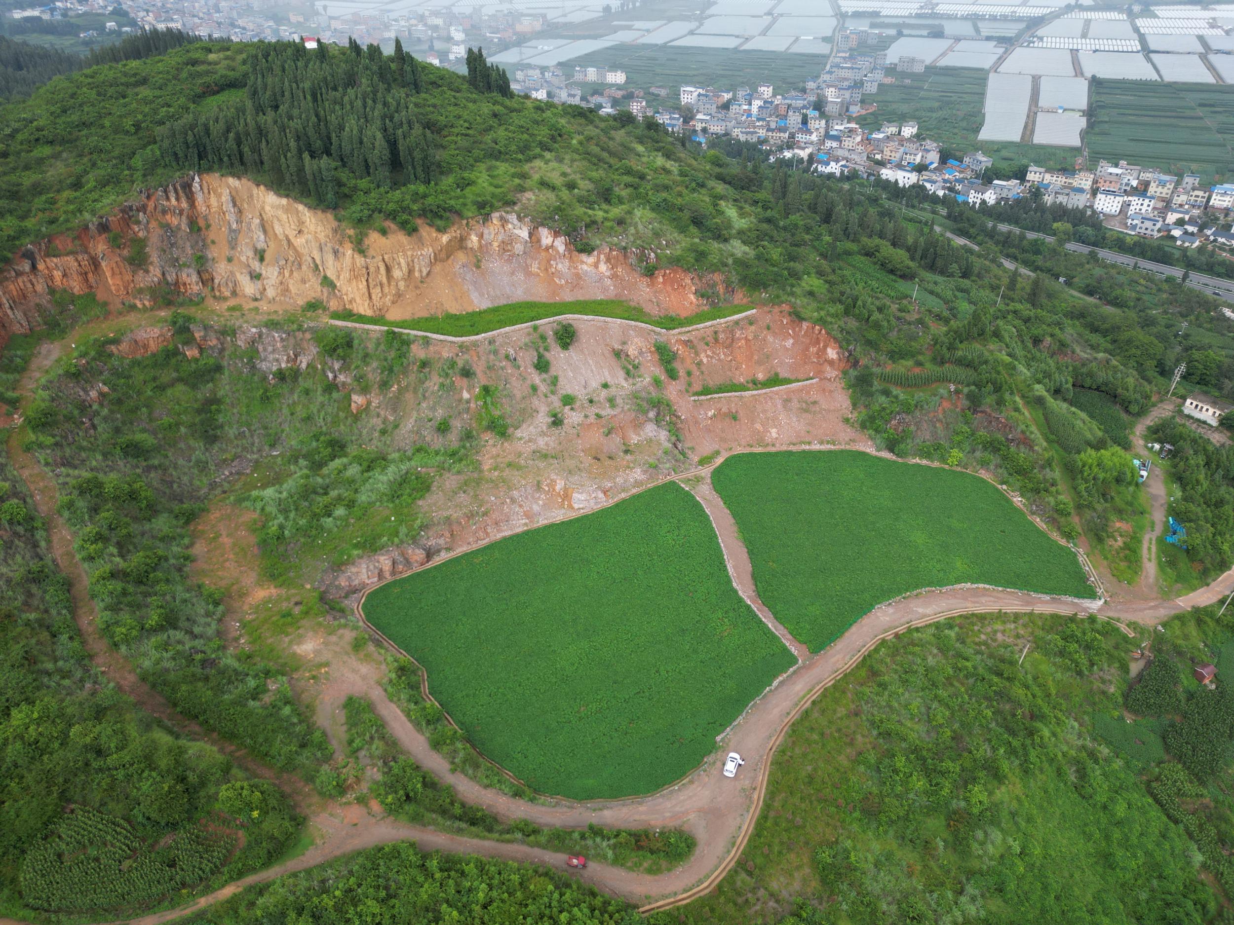 项目创新融合“分级削台+客土回填+截排水系统+植被重建”技术体系,并将海绵城市理念引入矿山修复,修建截排水沟、沉砂池等设施44处,大幅提升区域水源涵养能力。在植被恢复方面,优选云南松、藏柏、车桑子等乡土树种构建生态防护骨架,结合“乔木固坡、灌木护坡、草本覆绿”的立体种植模式,并搭配格桑花等观赏草本花卉。据悉,项目累计种植各类苗木逾2.3万株,修复面积达776亩。复垦区域覆土厚度达0.5米,土壤有机质含量从治理前的0.3%提升至1.8%,达到国家耕地标准。
