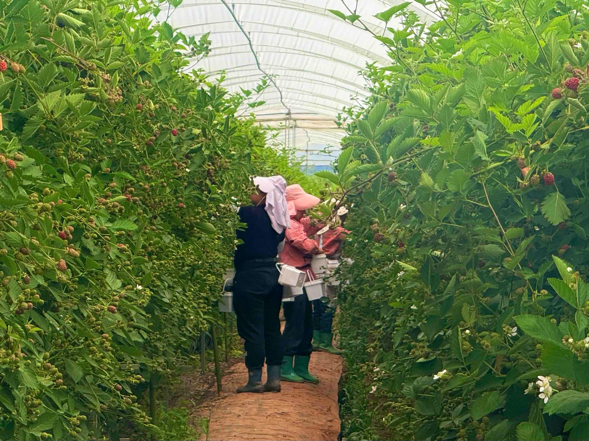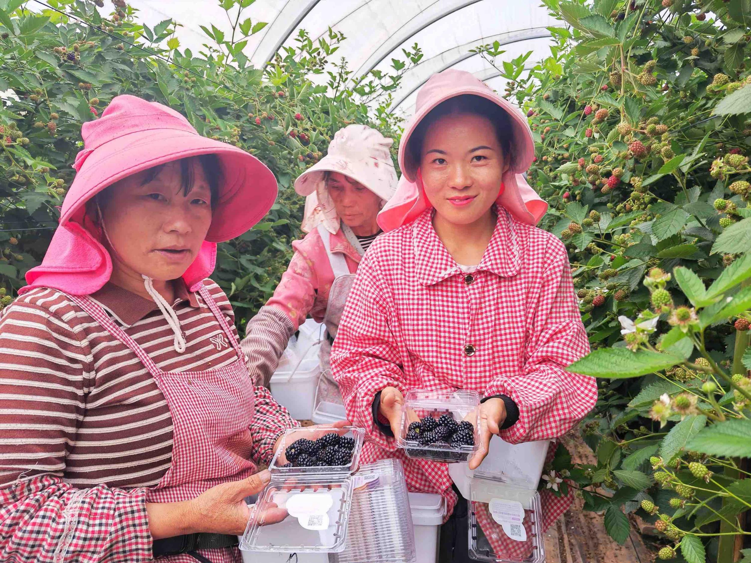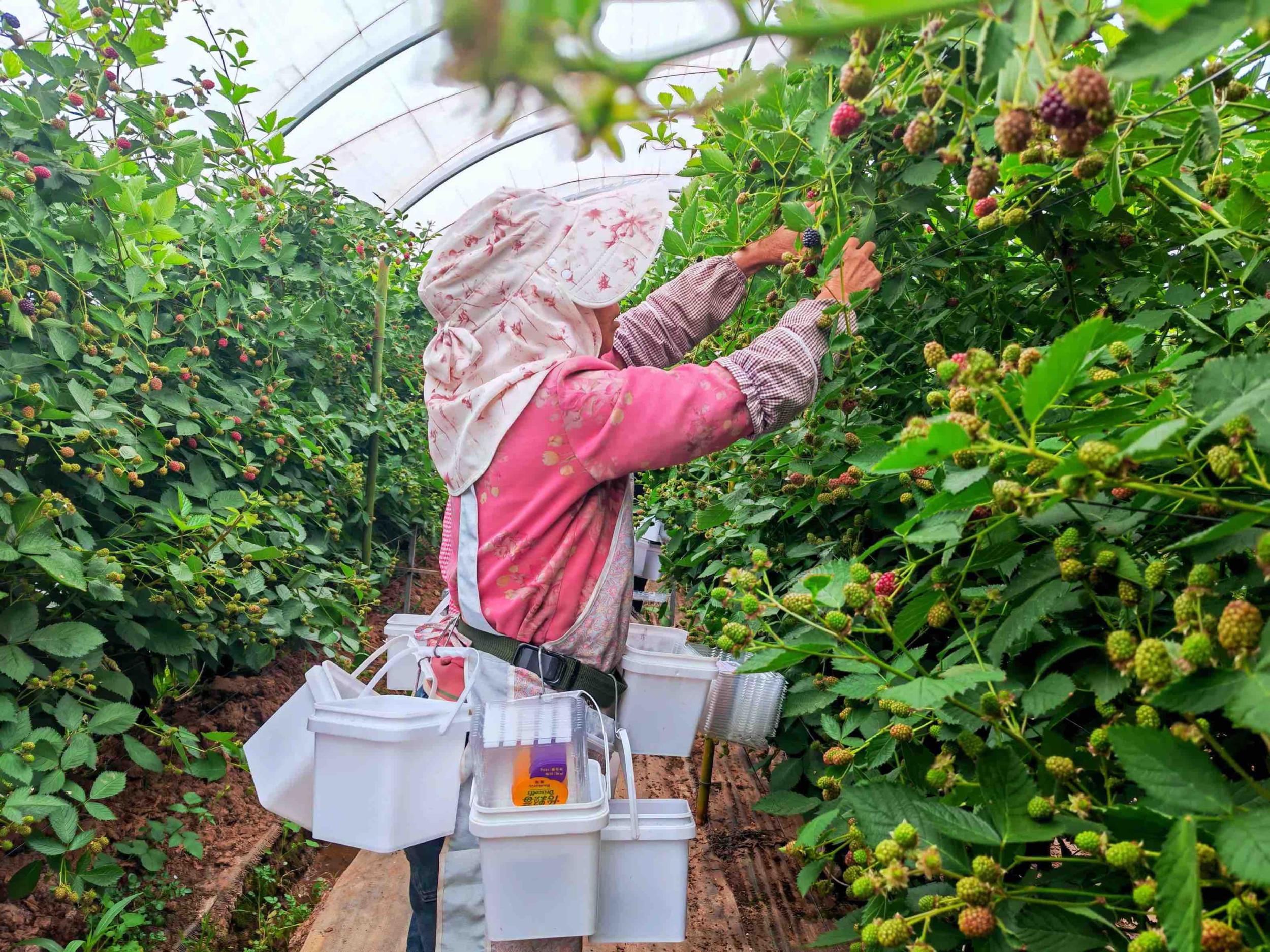 清晨,沾益区花山街道瀚蓝种植有限公司的黑莓种植大棚内,一颗颗黑莓缀满枝头,散发着香甜的果香。几十名采摘工人穿行在田垄间,将颜色深黑、果形修长的成熟果实摘下。这片曾经普通的田野,如今因特色产业的落地焕发出勃勃生机,更实实在在为当地群众铺就了一条在家门口就能增收的致富路。
