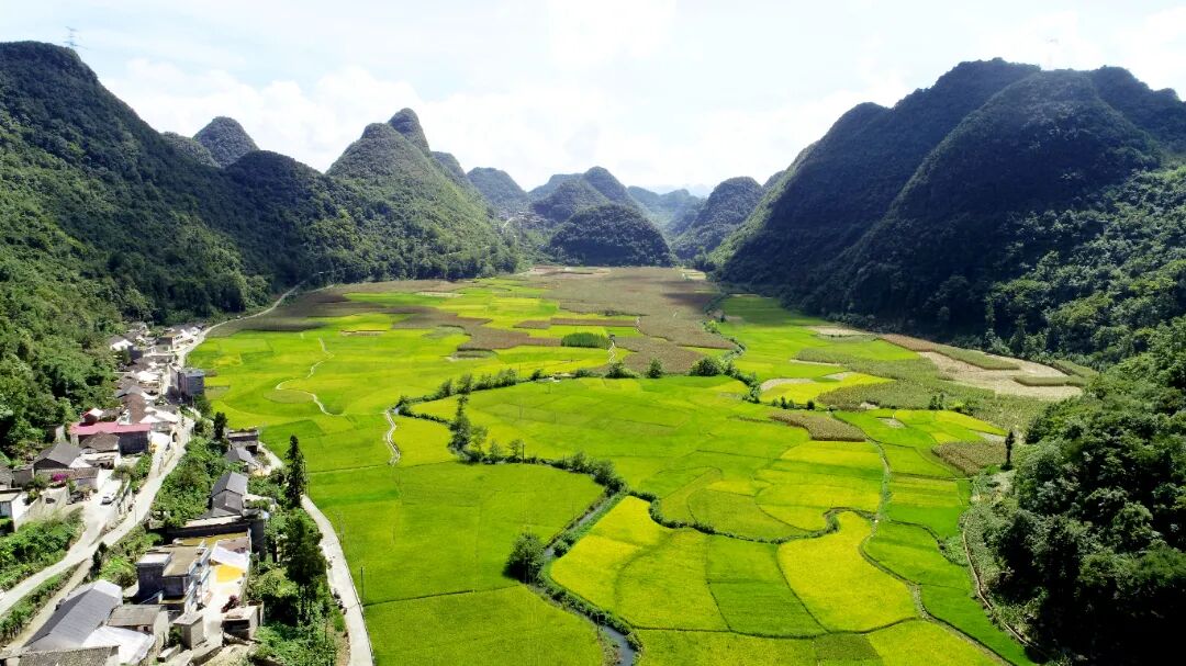 木马甲村的这个小谷坝最绝的是一条小河从槽谷中间盘曲而过,宛如传统戏曲中的水袖,气畅韵到,若翔似行。河水的源头就在村头的大山脚,河水清澈明净,汩汩而出,永不停歇,滋润着一坝的稻田。河里小鱼小虾成群,忽而顺下游漂流而下,忽而又顺上游逆水而行。小河顺着谷坝流淌近两公里后,跌入一个深潭,便汇聚在那里,形成一个天然湖池,谷坝也到尽头,四周又是高山如林,找不到半块平地。河水突然断流而下,形成一个不小的瀑布,瀑布清秀雅致,十分漂亮。湖池不大,水色碧绿如玉,从空中俯瞰,恰似一颗绿宝石镶嵌在峰林中间,神秘而富有活力。