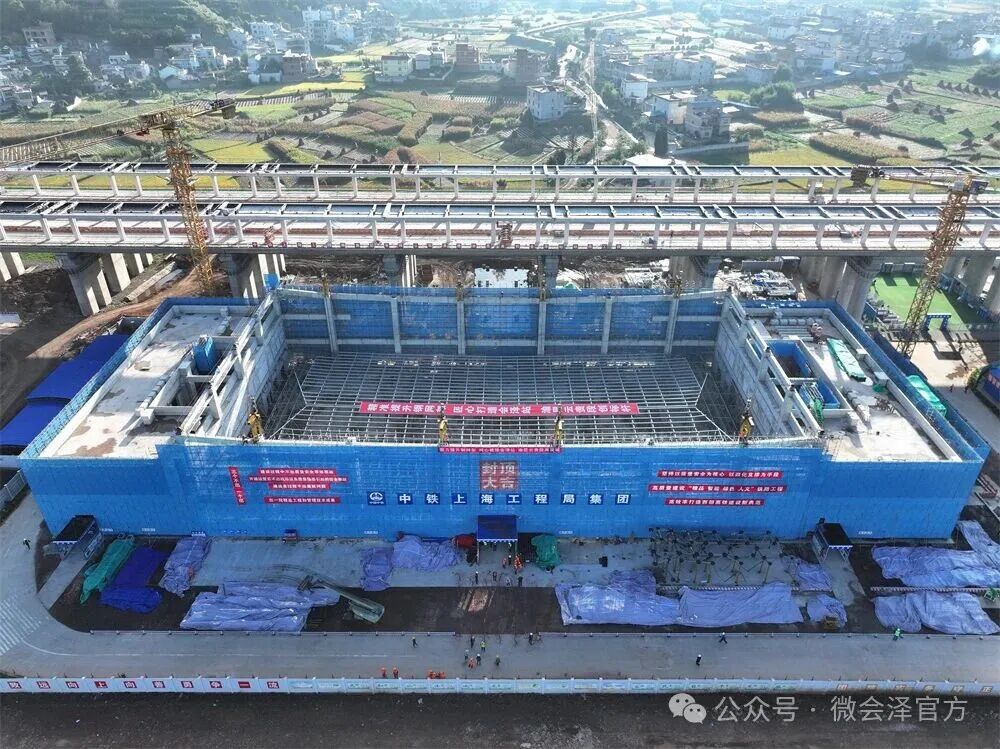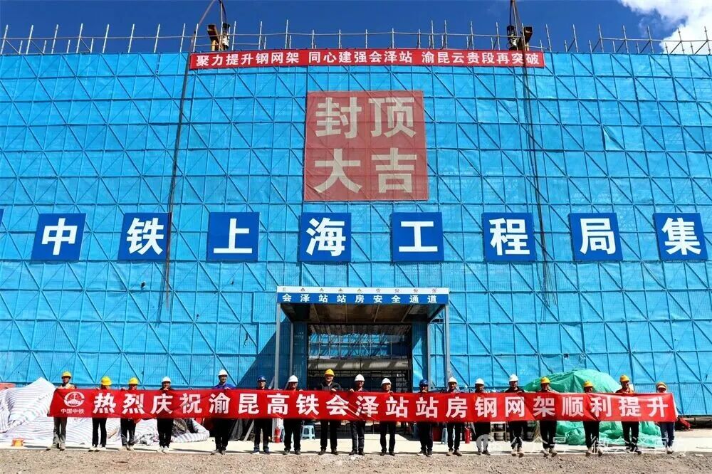 10月10日,由中铁上海工程局承建的渝昆高铁会泽站站房工程迎来关键节点——随着钢网架屋面提升作业的顺利完成,站房实现全面封顶,标志着项目建设取得重大阶段性成果,为后续工程的顺利推进奠定了坚实基础。