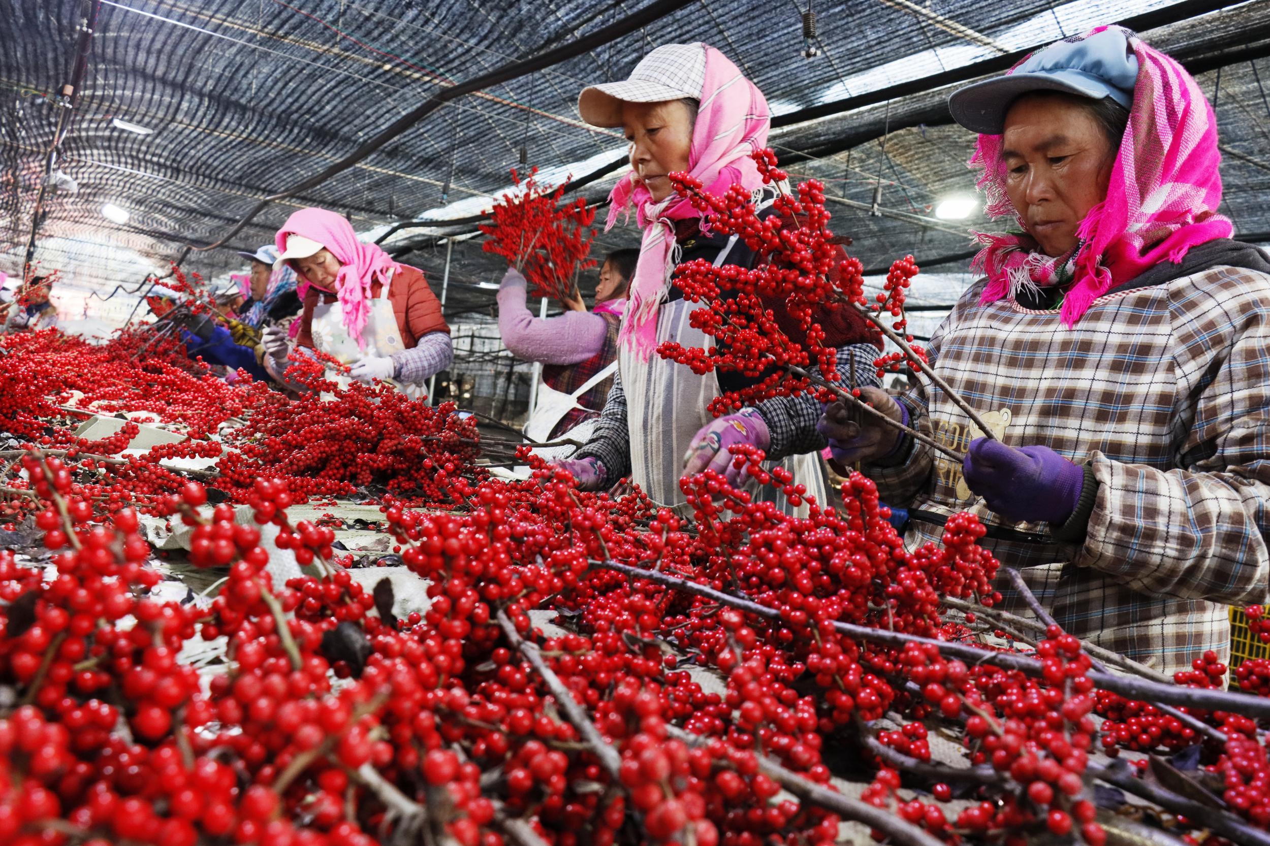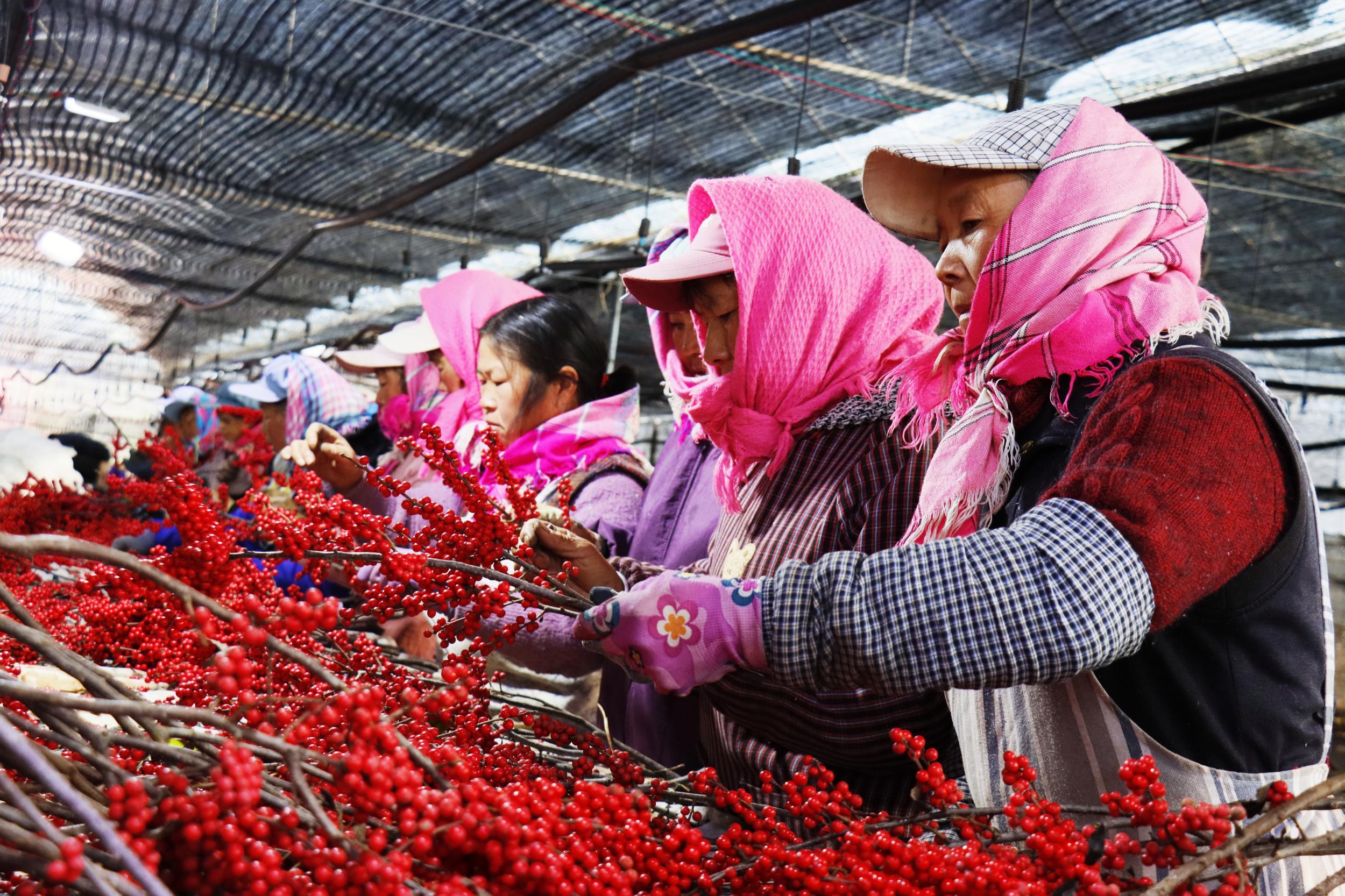 “分级的时候是根据侧枝的长短、果子的密度和大小、亮度来分级。像这种果子又密、侧枝也好的,就可以达到3A级,这个级别在市场上可以卖到很好的价格。今年冬青的品质好,大多数可以达到3A和2A级别。”务工群众黄文芬说。