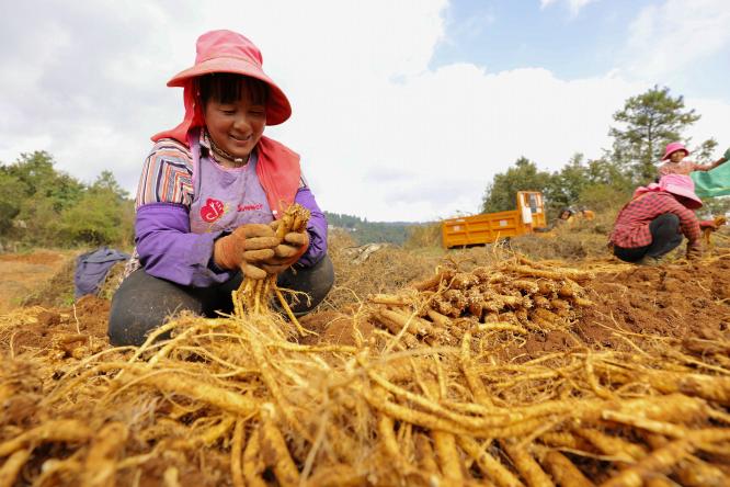 清晨的薄雾尚未散尽,龙海乡雨古村村民郑乔生、朱海民已经开始了一天的劳作。一株株根茎饱满的云南参被小心翼翼地从土中挖出,田垄间堆起小山般的褐色“珍宝”。