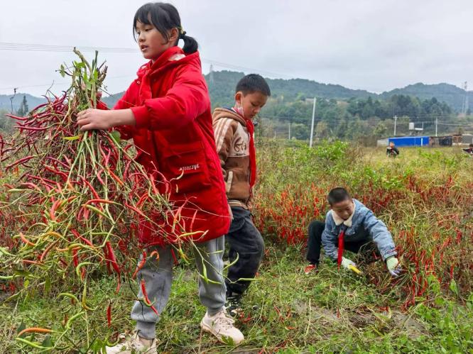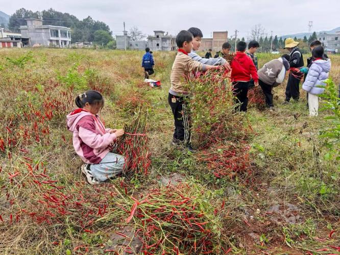 美术课在这里找到了鲜活素材。学校每月设定创作主题,孩子们带着画架、小板凳来到田间地头、动物圈舍旁,在拔草喂猪、观察动物的过程中完成创作,让劳动教育真正扎根泥土,也让各族孩子在协作中拉近了距离。甚至体育课也延伸至此,学校每年组织低年级孩子徒步往返8公里到山上农场采摘,在行走中锻炼体魄。