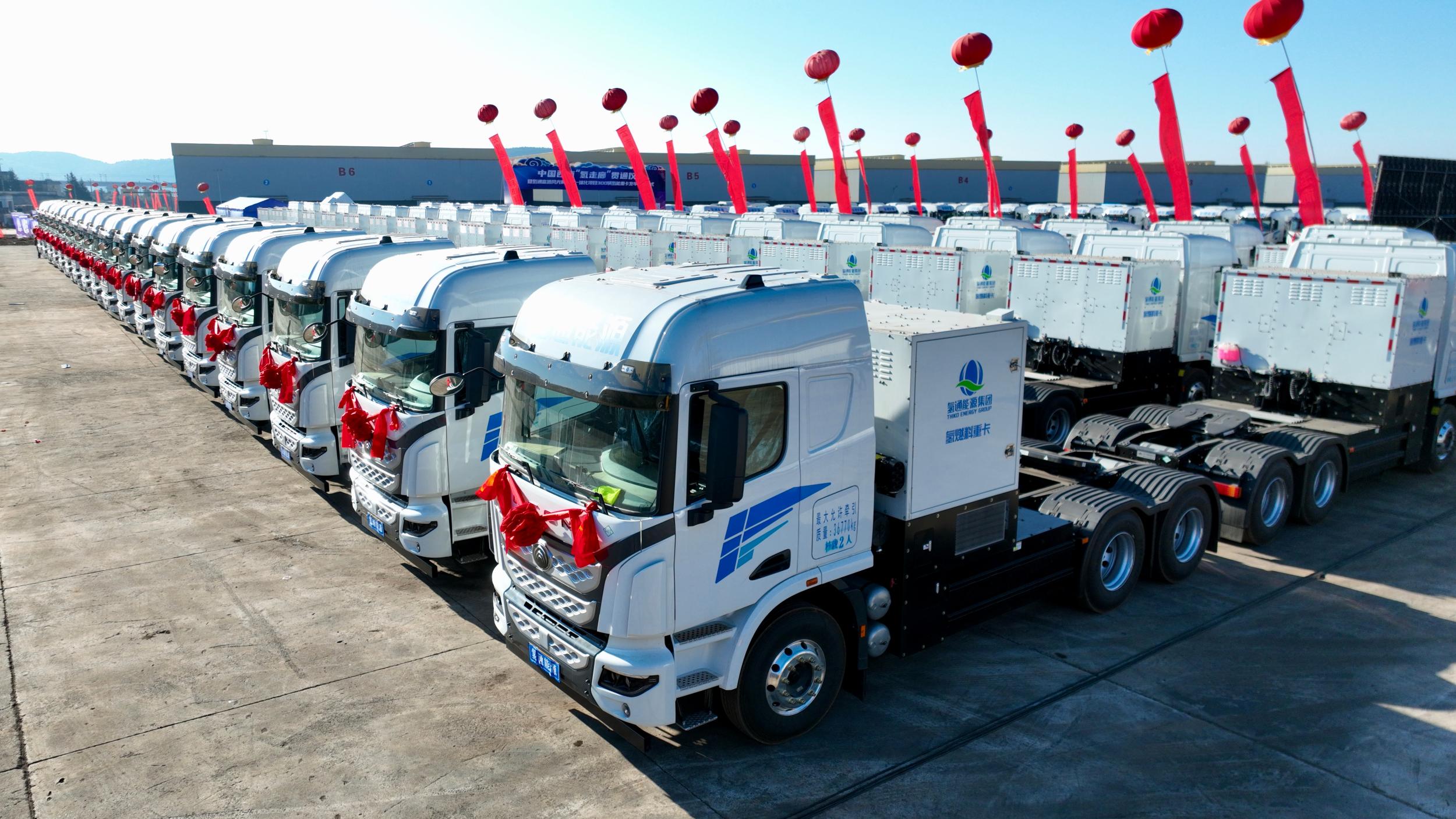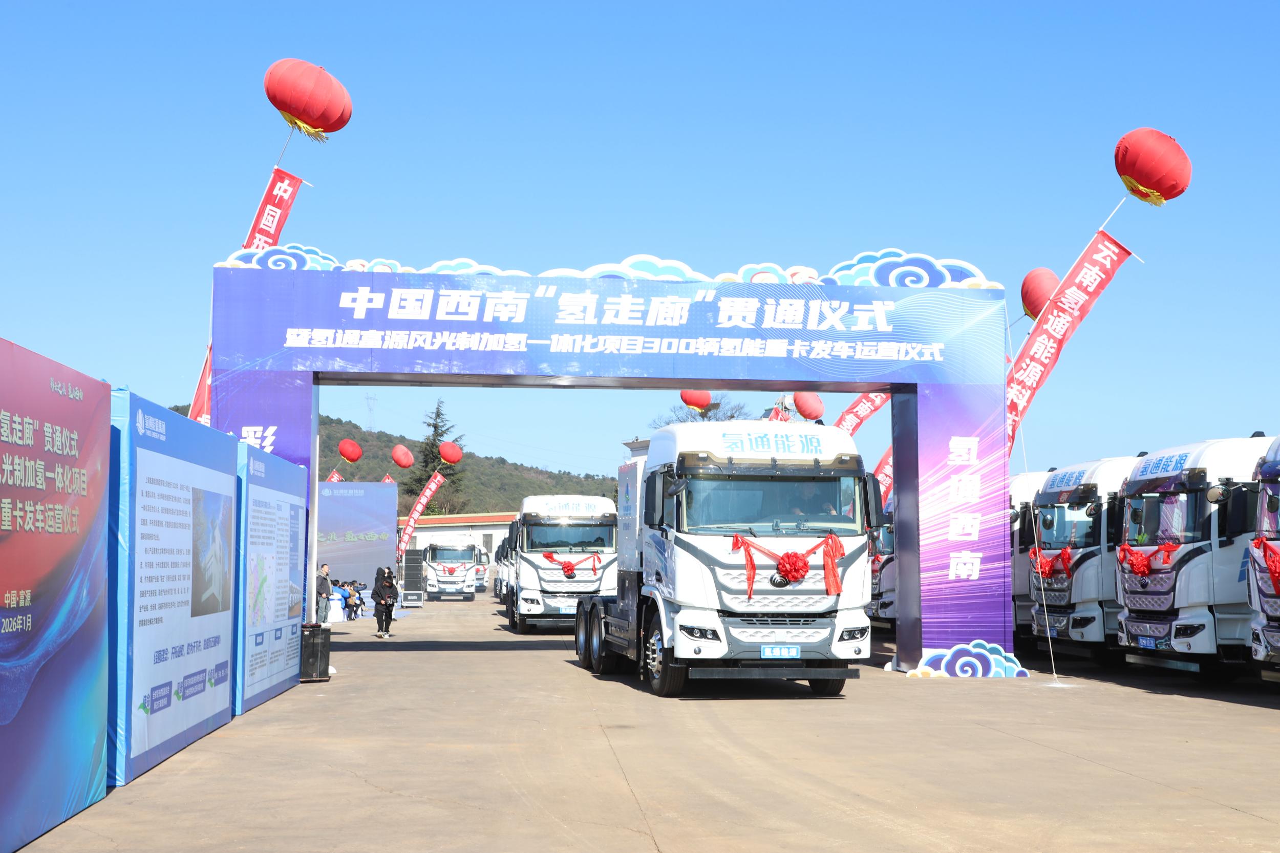 1月16日,中国西南“氢走廊”贯通仪式暨氢通富源风光制加氢一体化项目300辆氢能重卡发车运营仪式在曲靖市富源县举行。