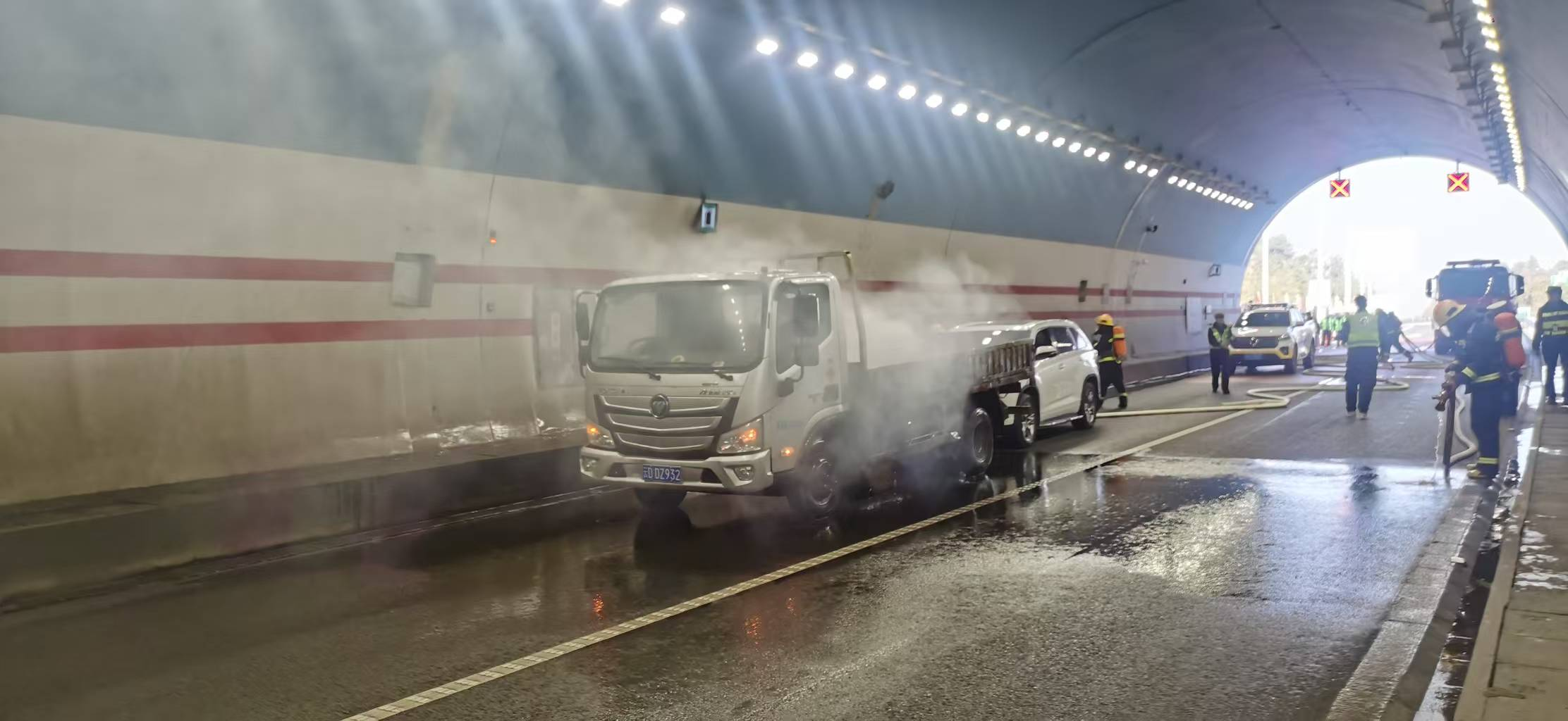 为全面提升交通运输复杂险情应急处置能力,近日,曲靖市交通运输综合行政执法支队麒麟大队联合多家相关单位,在麒师高速公路东山隧道开展特长隧道交通事故起火应急处置实战演练。