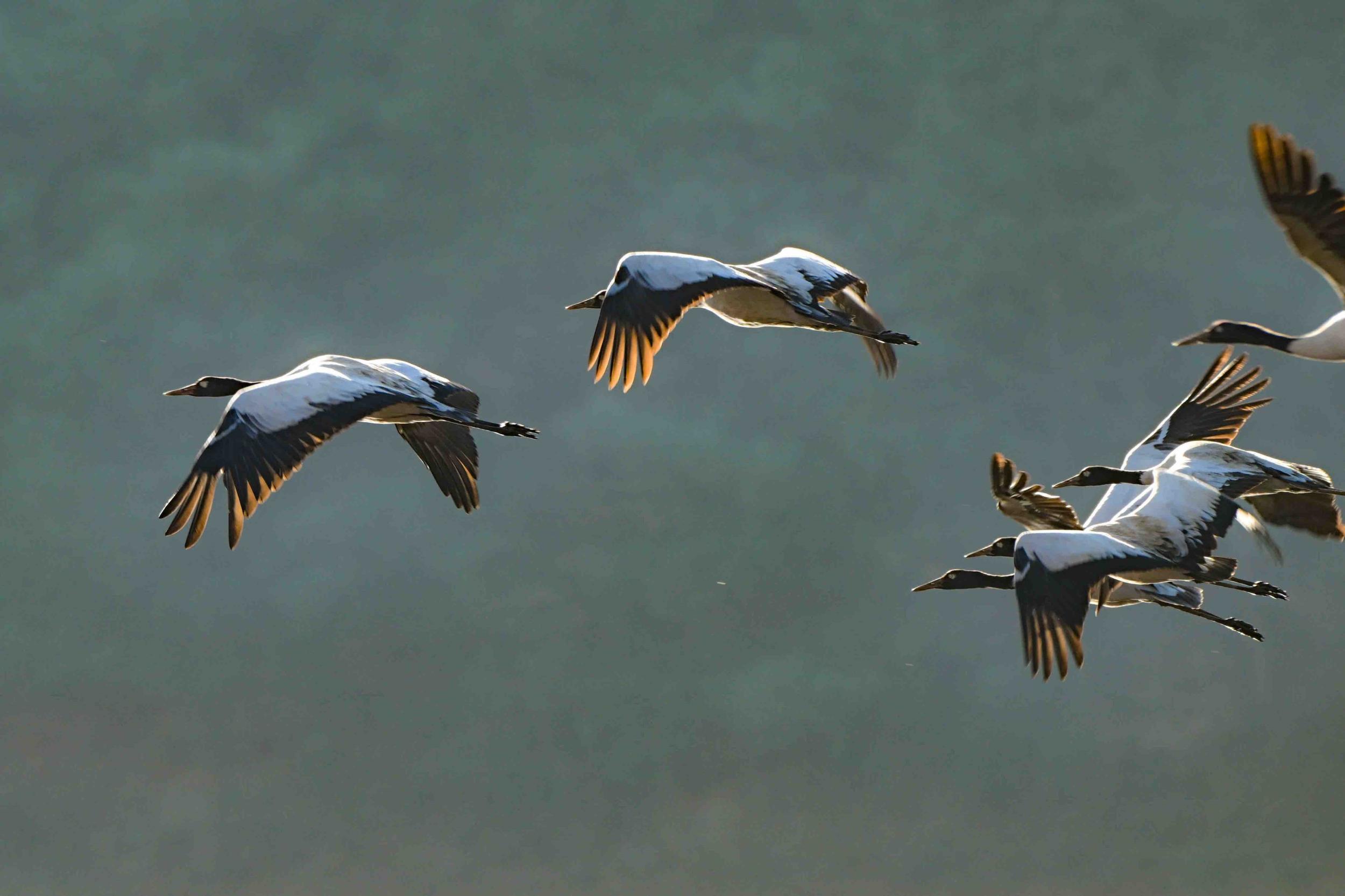 今年,位于云南省曲靖市会泽县的会泽黑颈鹤国家级自然保护区内,鹤类总数有所上升,达到1611只。念湖湿地内,越冬的黑颈鹤时而优雅踱步,时而振翅追逐,时而引颈长鸣,有的还展开双翼穿梭于云雾之间。