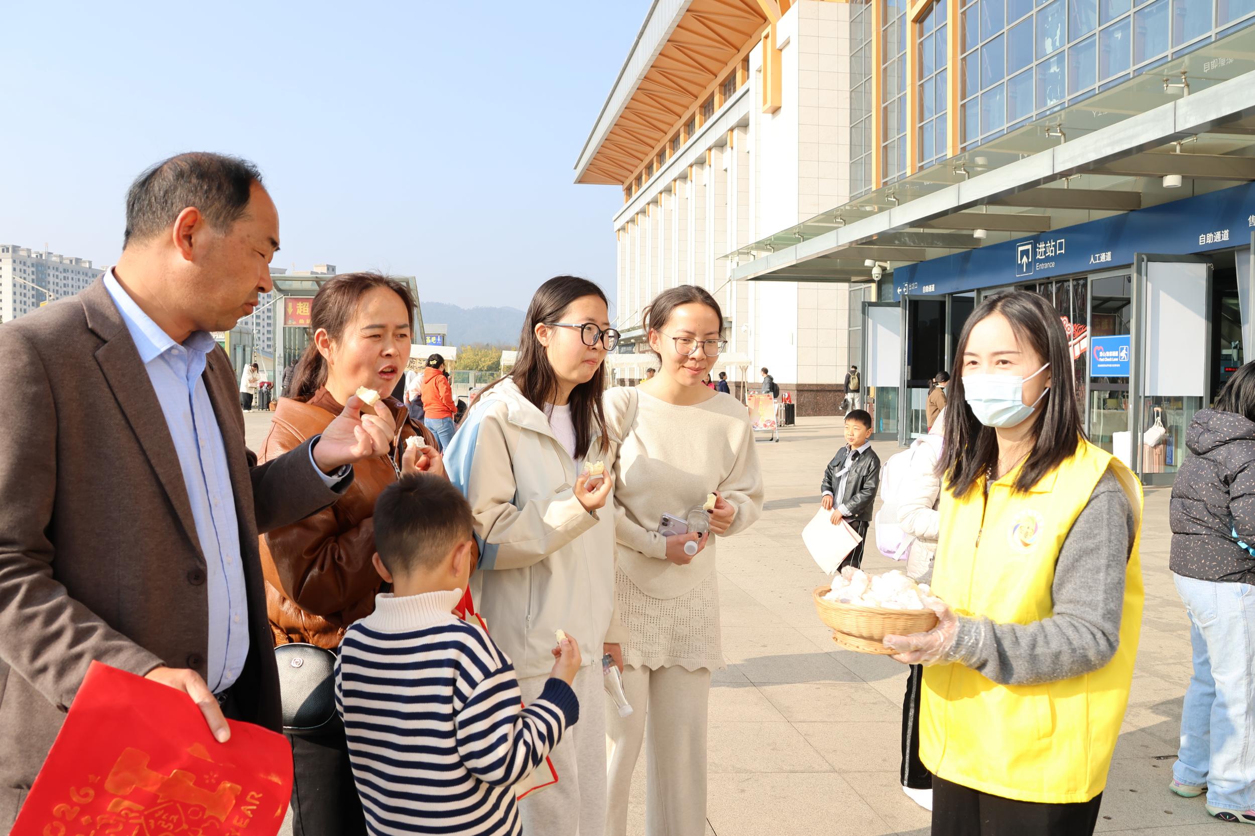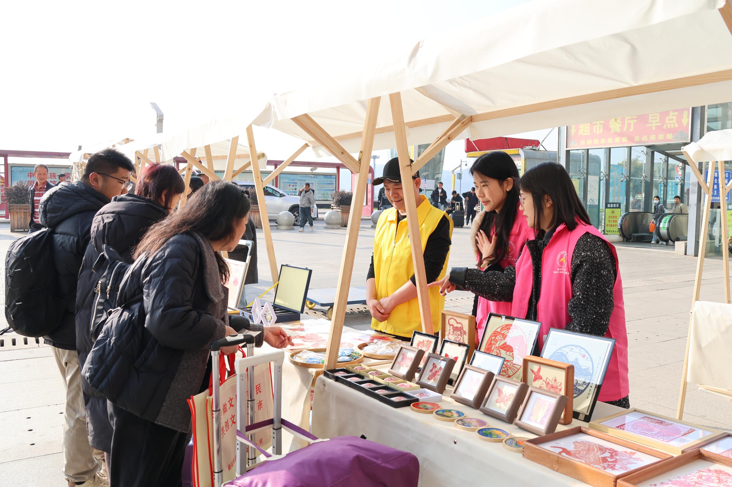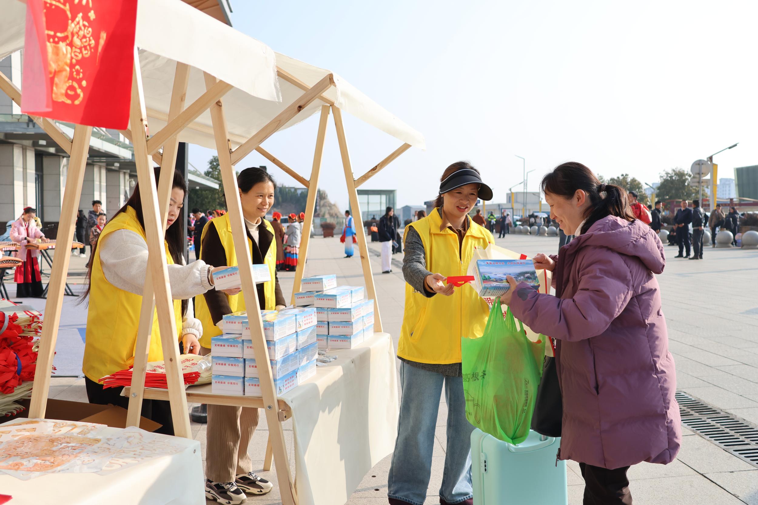 “您好,送您一瓶珠江源矿泉水,祝您旅途愉快!”身穿红马甲的志愿者穿梭在候车大厅,将一份份精心准备的“暖心福袋”递到旅客手中。福袋里,不仅有热气腾腾的本地小吃、清冽甘甜的矿泉水,还有一份详尽的沾益旅游攻略和一幅精美的非遗剪纸。正准备前往外地的李先生接过福袋,惊喜地说:“原本以为候车会很无聊,没想到赶上了这么有意思的活动,了解了沾益,还收到了祝福,这趟旅途从开始就充满了意义。”