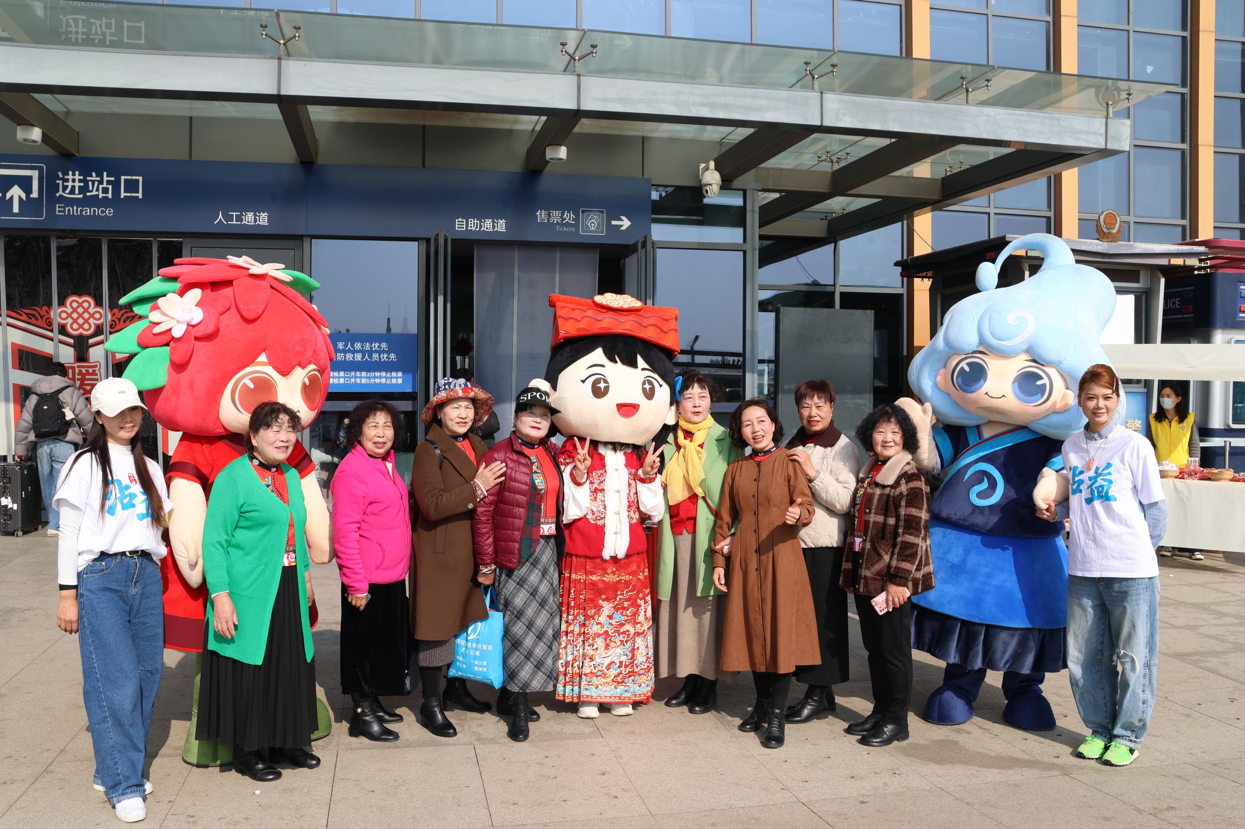 活动的高潮,当属IP人偶们的闪亮登场。“珠珠”“源源”和“红瓦妹”这三个圆滚滚、萌态可掬的形象一出现,立刻成了全场焦点。他们一会儿在舞台上配合演员表演,笨拙又可爱的动作逗得大家哈哈大笑;一会儿又溜达到人群中,和孩子们握手拥抱,配合拍照,还时不时“变”出小礼品送给大家。原本陌生的车站,因为这些可爱的身影,变得亲切而温暖。