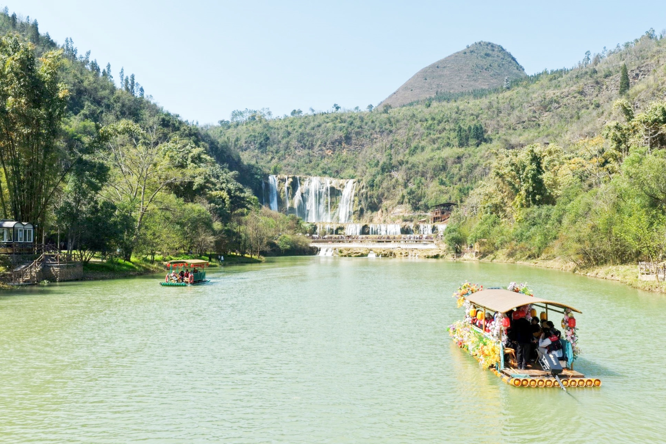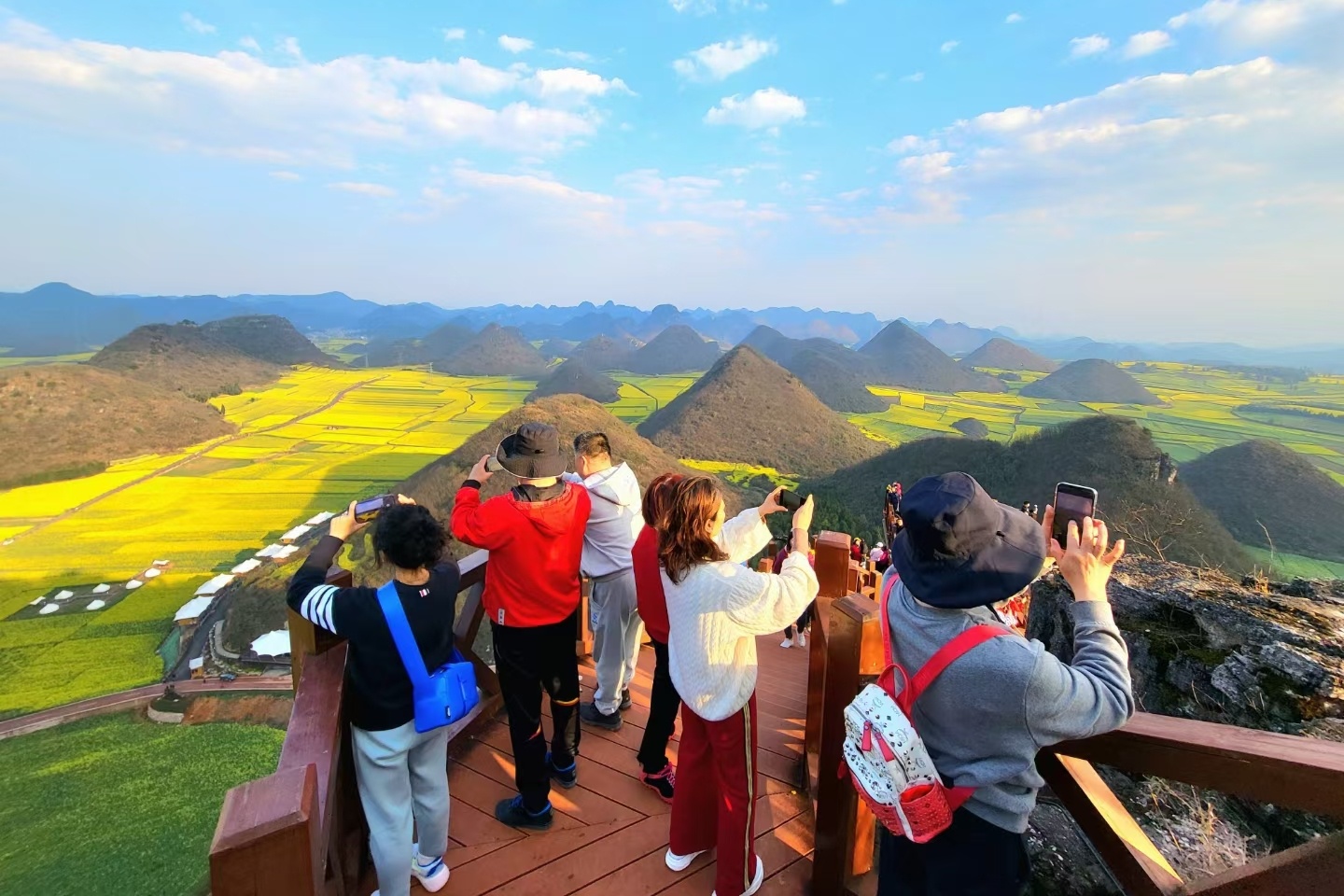 九龙瀑布飞珠溅玉,与油菜花田构成“瀑在花中、花伴瀑生”的独特景致,景区日均接待游客超万人。2026年,景区在传统观瀑、竹筏、索道等项目的基础上,全新打造瀑布咖啡、民族扎染体验等业态,把自然景观与文化体验融为一体。