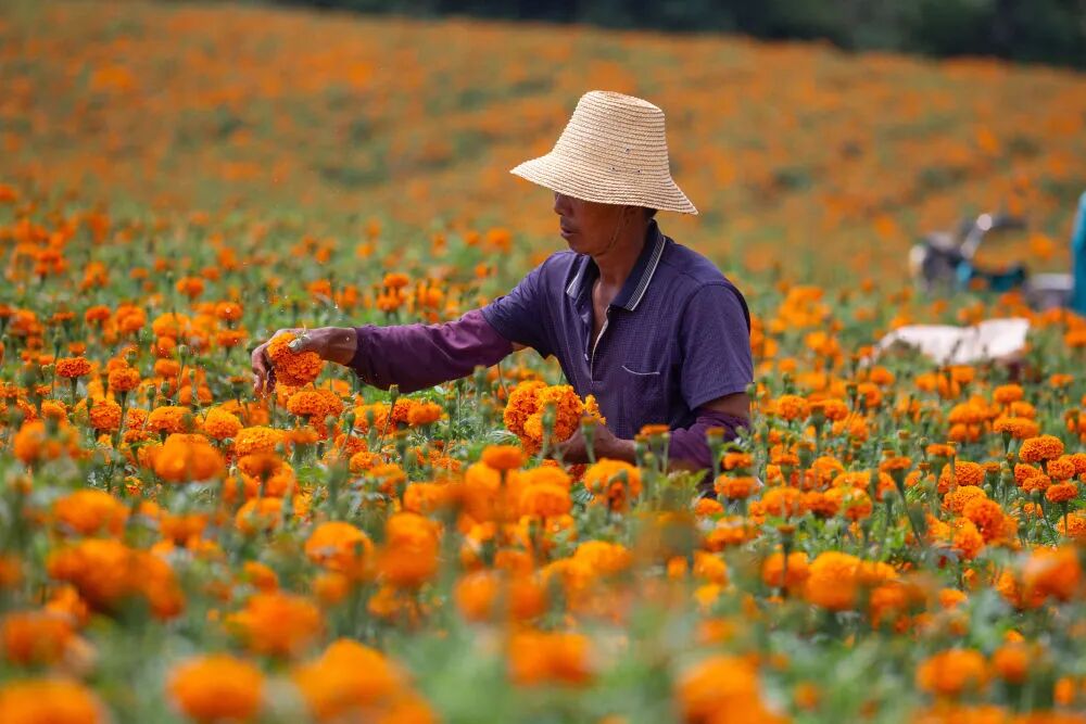 在月望乡、张安屯街道等地,金黄色的花海连绵起伏,花农们正抓紧采收,万寿菊成为“订单农业”模式下的“致富花”。马龙区通过“公司+基地+农户”的订单农业模式,与龙头企业合作建立起稳定的种植和销售机制,有效保障了农户收益。目前,全区万寿菊种植面积已达1.4万余亩,年产值超过2900万元,真正成为带动农民增收的“金色产业”。