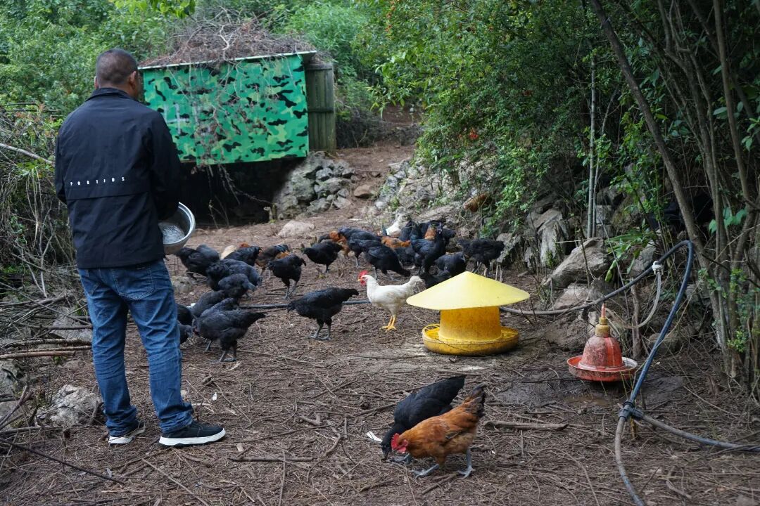 谈及养殖初衷,钱勇坦言源于一次在电视上的偶然见闻。“家人都爱喝乌骨鸡汤,看到五黑鸡养殖前景后,就动了试试看的念头。”钱勇说道。从零经验起步,他先后请教养殖专家、赴外地养殖场取经,最终选定白石岩村这片“天然养鸡场”,这里既有现成的养殖基础,又有山清水秀的生态优势,盘活起来就是个金窝窝。