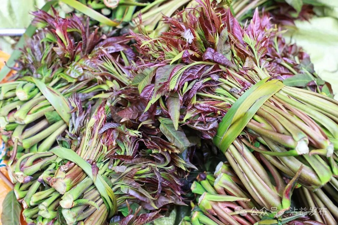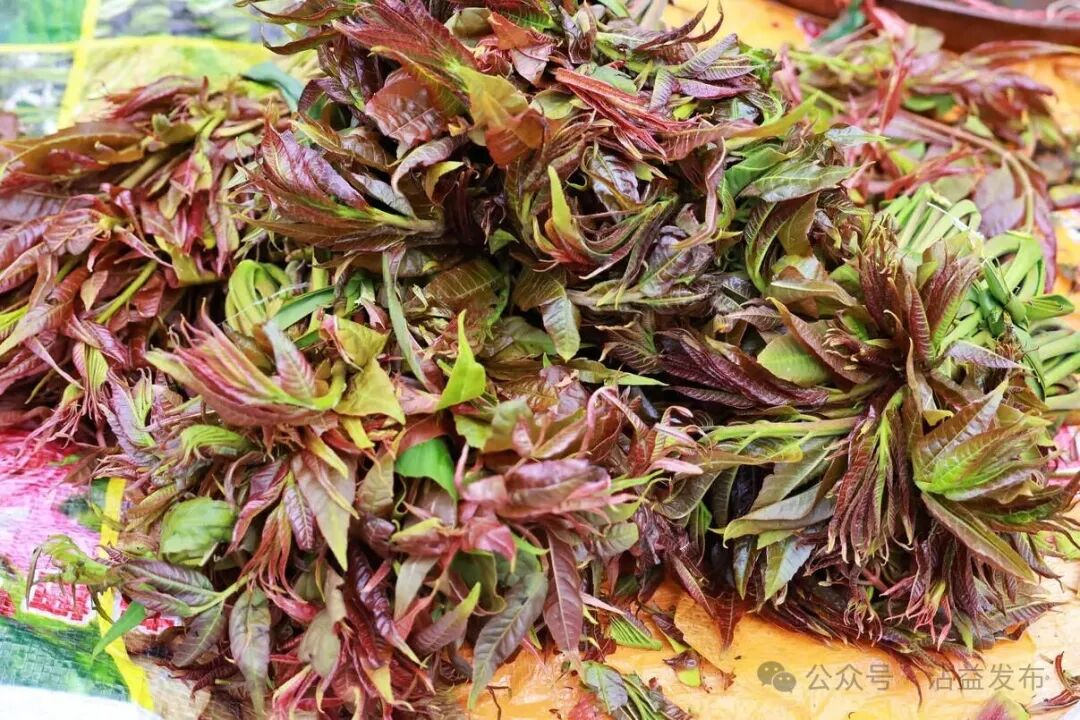 近日,记者在沾益城区各农贸市场看到,不少蔬菜摊位都将当天刚到货的头茬香椿摆在了最显眼的位置。这些头茬香椿芽色泽紫红油亮、叶片肥厚饱满,根根鲜嫩欲滴,散发着浓郁而独特的香气,成为清晨市场里最抢手的“尖货”。